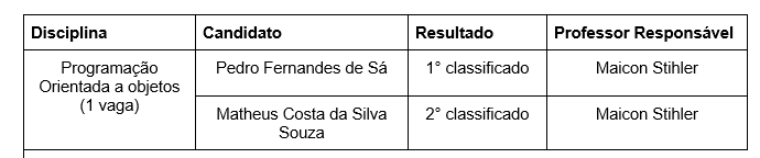 O Subchefe do Departamento de Computação do Centro Federal de Educação Tecnológica de Minas Gerais/Campus Leopoldina, Prof Matheus Ávila Moreira de Paula, torna público o resultado do processo seletivo referente a 1 (uma) vaga remanescentes de bolsas do Programa de Monitoria – Edital nº 141/2025 de 21 de agosto de 2025.
